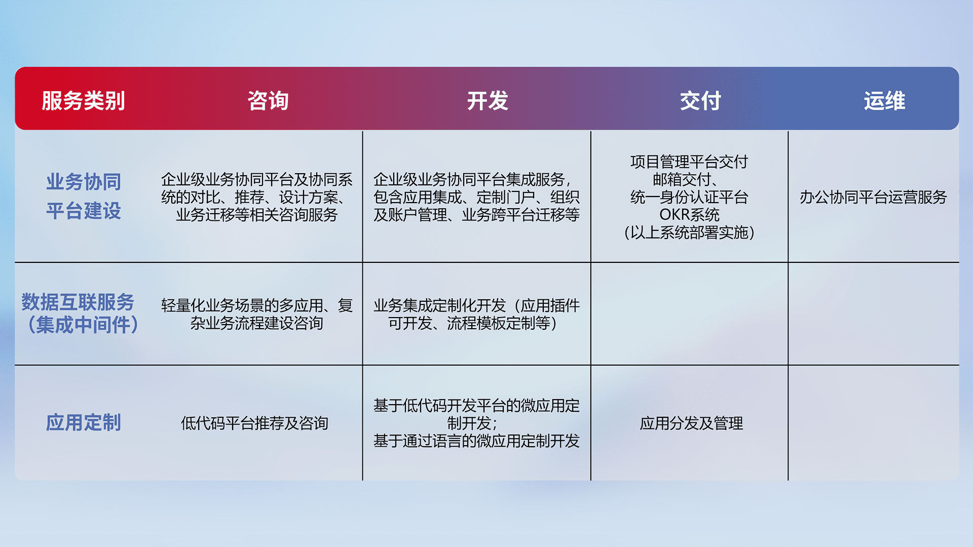 针对钉钉、、、、企微、、、、IDaas等平台级产品提供产品的规划、、、方案、、交付、、、、定制化开发等服务,,,实现如统一协同办公、、、智能客户服务、、混合会议管理、、智能数据查询、、等业务场景,,实现数字化转型。。。。